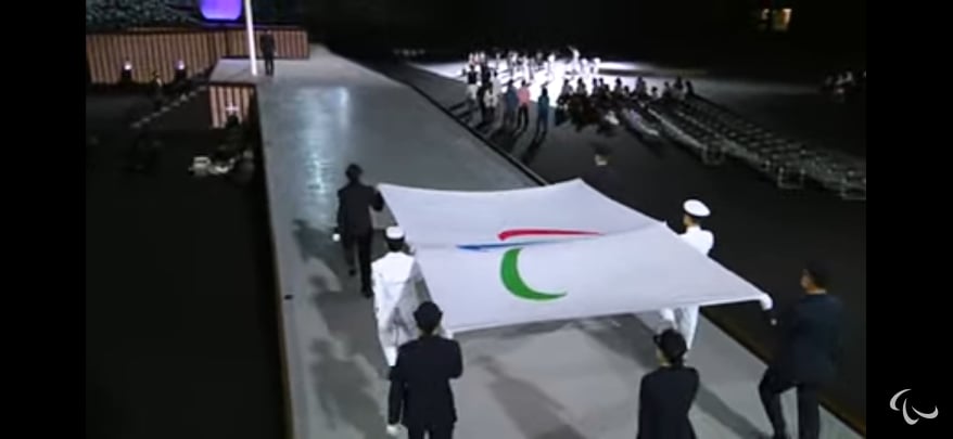 Le drapeau japonais qui a été apporté par des anciens athlètes paralympiques japonais et hisser par des hauts gradés de l’armée japonaise